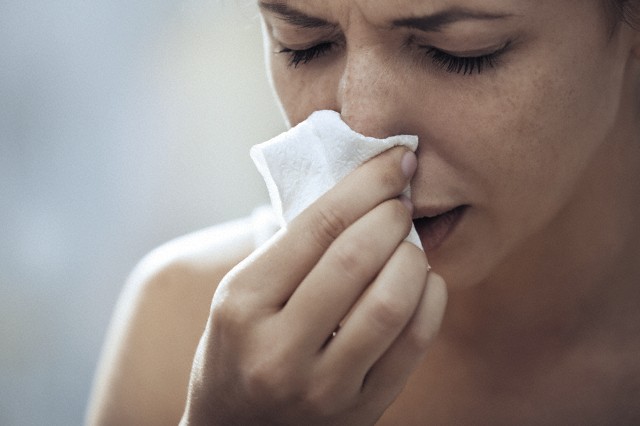 Woman blowing nose and sneezing --- Image by © Arman Zhenikeyev/Corbis